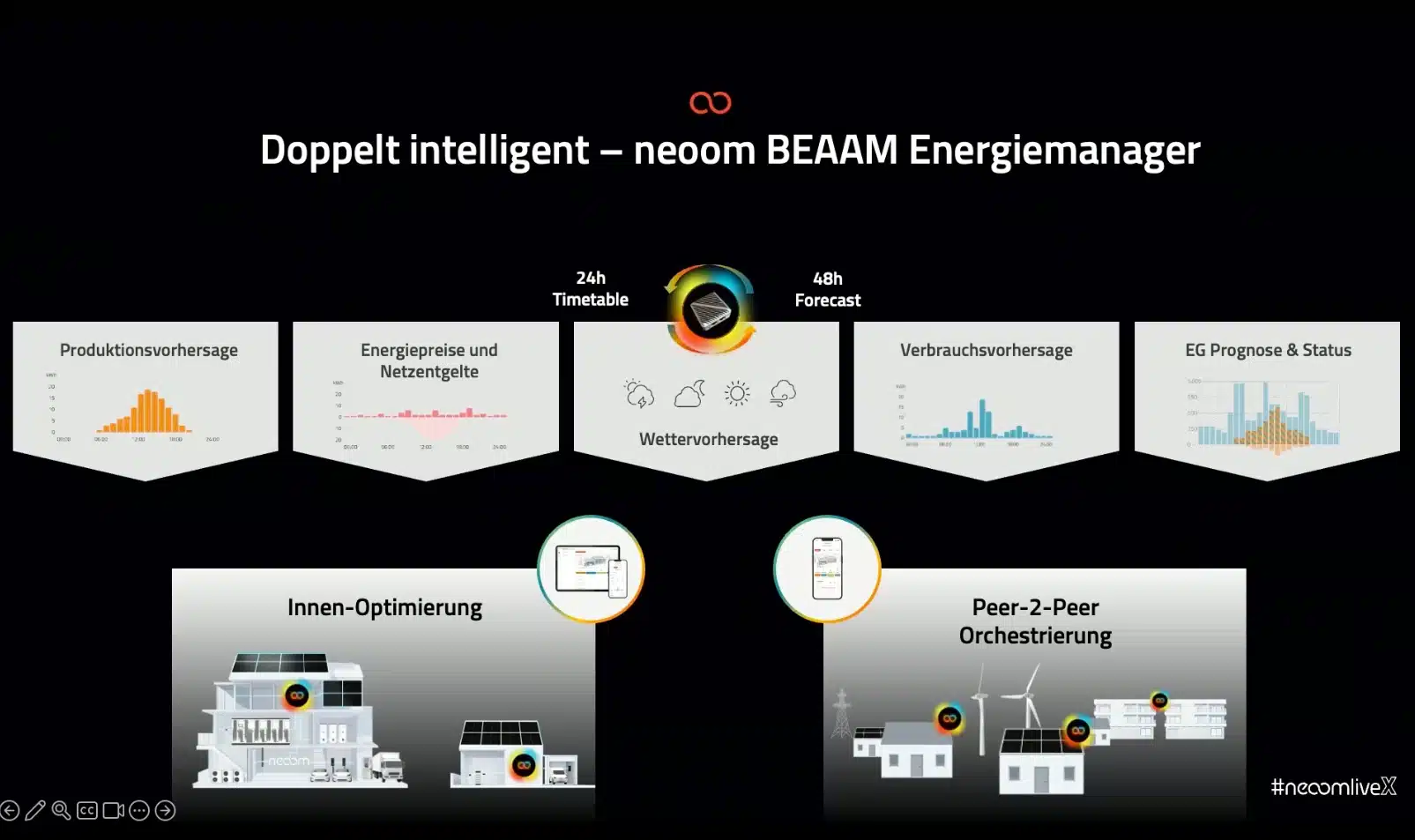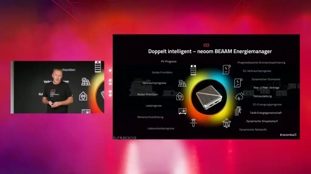 Bei unserem Remote-Partnerevent #neoomliveX am 19. November 2025 drehte sich deshalb alles um eine zentrale Idee: Wie schaffen wir es, diese wachsende Komplexität so zu steuern, dass sie für Kund:innen maximalen Nutzen bringt und gleichzeitig das Energiesystem entlastet? Die Antwort darauf heißt doppelte Intelligenz – mit dem neoom BEAAM als Herzstück.